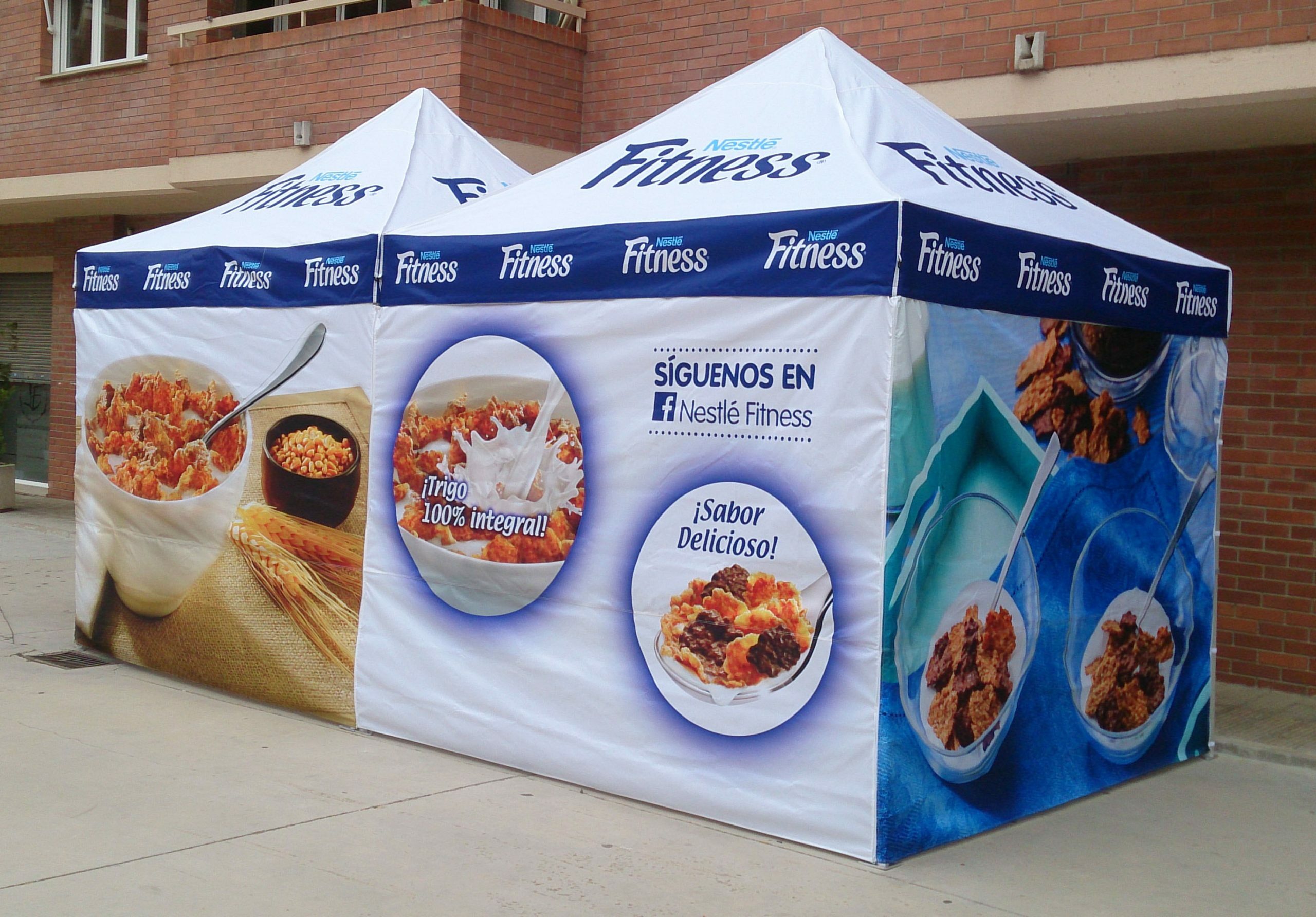 TECHO Y LATERALES Tejido de poliester recubierto impermeable e ignifugo con calificación m2 según norma UE 23 – 727:90 certificado por ENAC. Impresión completa en FullDigital Print®. Refuerzos y sellado interior antilluvia.